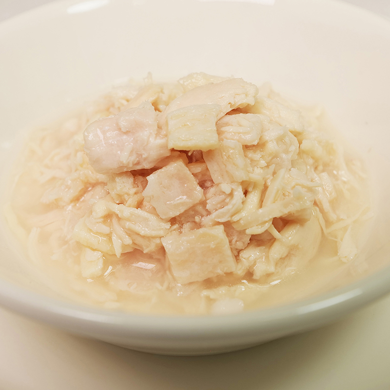 | 素材 | 【原材料】 鶏肉、調理水、鶏肉のプロシュート(ハム)、米 【成分】 粗タンパク質:18.0%以上、粗脂肪:0.35%以上、粗繊維:1.0%以下、粗灰分:3.0%以下、水分:80.0%以下 【エネルギー】 78.05Kcal/100g |