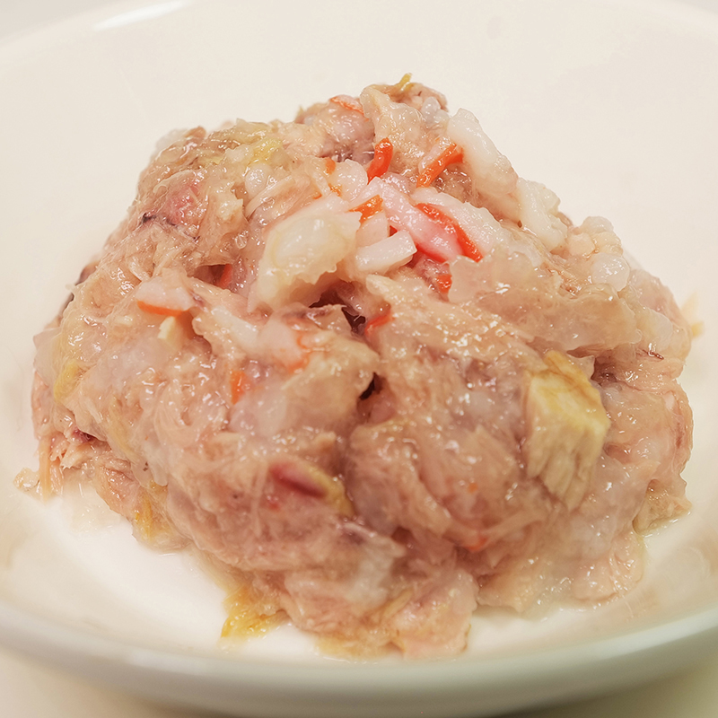 マグロとすり身で、被毛の健康に必要なオメガ3脂肪酸を補給し、嗜好性と水分補給に配慮したジュレ仕立てのレシピです。
