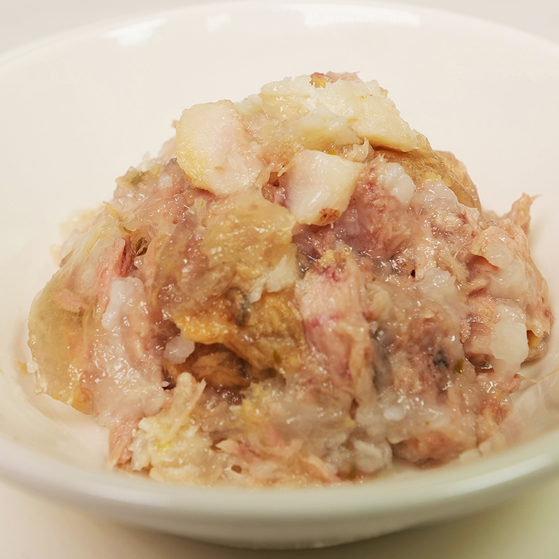 マグロと鯛にリンゴを加えることでミネラル、食物繊維をバランスよく配合、嗜好性と水分補給に配慮したジュレ仕立てのレシピです。