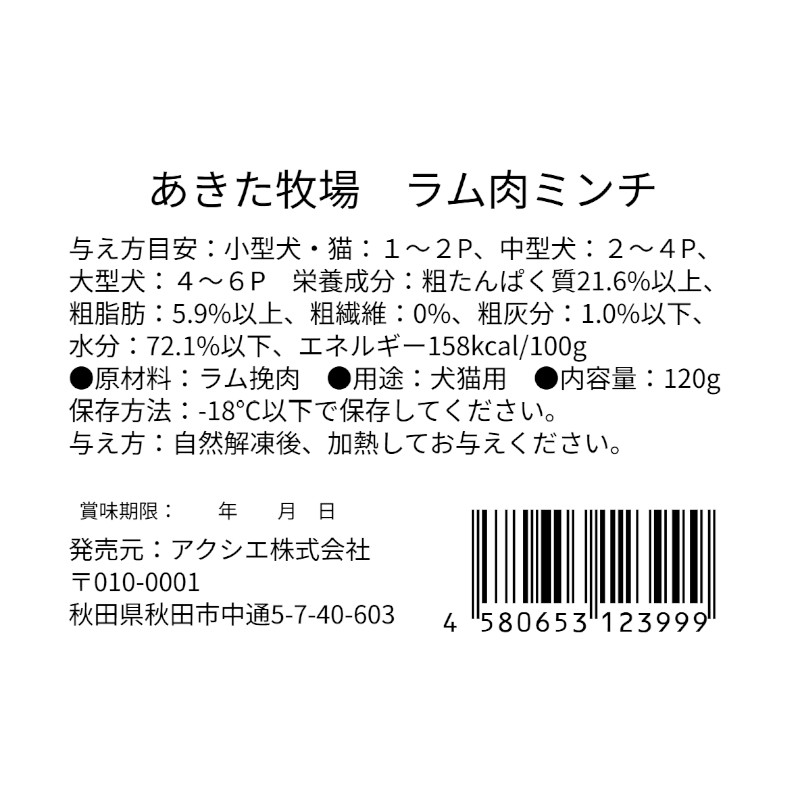 | 素材 | 【原材料】 ラム挽肉 【成分】 粗たんぱく質:21.6%以上、粗脂肪:5.9以上、粗繊維:0%、粗灰分:1.0%以下、水分:72.1%以下 【エネルギー】 158kcal/100g |